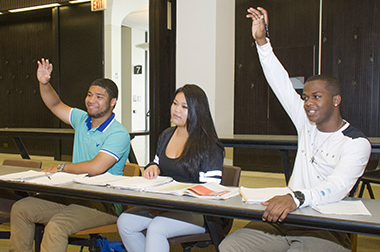 From left, new freshmen Moises Urena, Adriana Ng and Keyshaun Scales are ready for class at UAlbany's EOP Orientation. (Photo by Mark Schmidt)