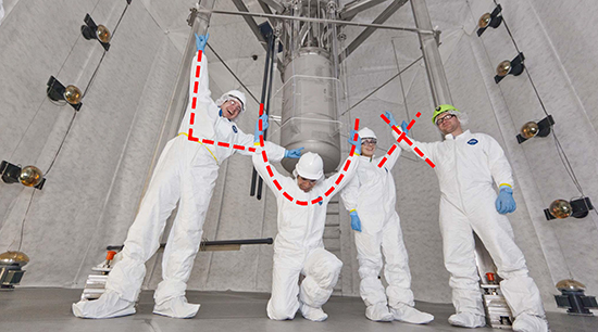 Scientists in the underground Large Underground Xenon (LUX) experiment pose playfully with the LUX dark-matter detector, filled with 600 pounds of liquid xenon. At right is UAlbany postdoctoral scientist Jeremy Mock. |