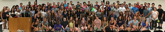 Dr. Hui-Ching Chang, center, with the incoming class of UAlbany's Honors College. |