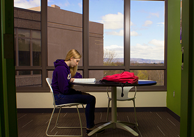 A student in Liberty Terrace reads by natural light. (Photo by Mark Schmidt) |