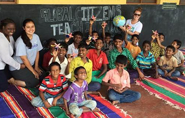 During the internship, Marisa Douglas, (holding the globe) had the opportunity to teach English to children at the Vedike school, the rural campus in Karnataka. |