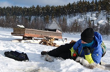 Cara Ocobock takes a break from data collection to do some ice fishing at a river near the Sami village Kuttura. (Photo by Minna Turunen)