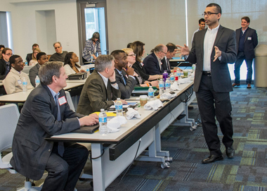 Sanjay Goel, principal investigator of UAlbany’s Blackstone LaunchPad, talks to a panel of judges during February’s entrepreneurship competition. (Photo by Mark Schmidt)