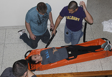 Five Quad student volunteers practice transport during a training session last week. (Photo by Naomi McPeters) |