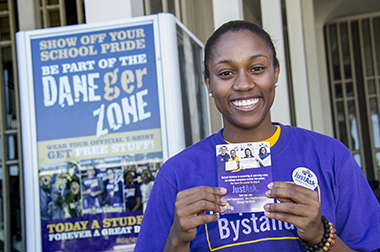 Holloway, a junior criminal justice major from Brooklyn, N.Y., stopped at a table in front of the Campus Center one sunny day in October to sign up for the #JustAsk Empowered Bystander training. He is part of Project SHAPE, which educates other students about sexual health.