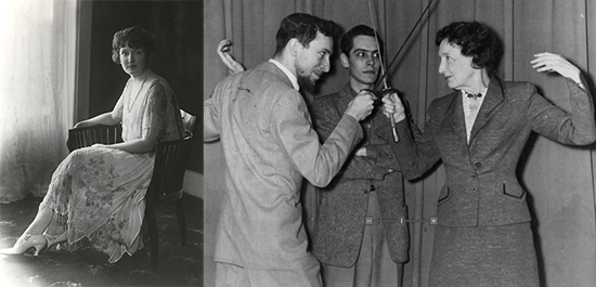 At left, Agnes Futterer's 1916 yearbook photo. At right, longtime professor Futterer engages Arthur Lennig BA '54, MA '56 — who himself went on to a long and distinguished career as UAlbany professor of film and well-published film historian — in a 1955 dramatic duel. Fellow acting student Donald Duclos, BA '54, MA '55, looks on. (Photos courtesy of UAlbany Archives) |