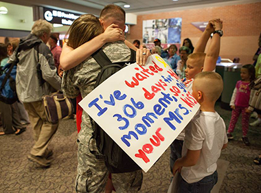 Army Reservist Chris Derrick, his back to us, is greeted at Albany Airport after his third and final combat deployment by his wife Raquel and sons Connor (arms up) and Carson. |