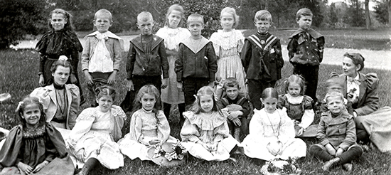 Anna Pierce, far right, poses with her classroom of students in the primary department of the Normal College's "model school" in the late 1890s. The teacher at left is Aurelia Hyde '95. (Photo courtesy of University Archives) |
