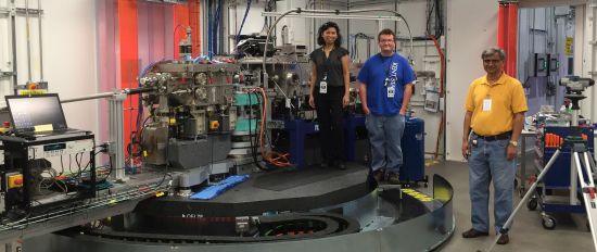 Associate Vice President for Research Satyendra Kumar, right, worked with his post doctorate associate Deña M. Agra-Kooijman, left, and PhD student Lewis Sharpnack at the Brookhaven National Laboratory. |