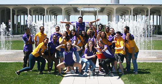 From left, Shelby Mack, Pam Mejia, Matthew Martinez and Jaleen Fraser welcome incoming freshmen and their families to UAlbany. |