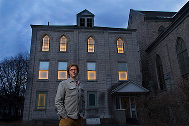 Professor Adam Frelin stands in front of one of the buildings included in "Breathing Lights," a multi-city art installation that lit abandoned structures with glowing, pulsing light. (Photo by Paul Miller)