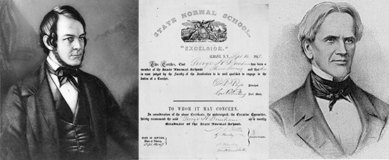 Left to right, UAlbany's first leader, David Perkins Page, the oldest extant diploma of the institution, from 1847 to George H. Dunham and signed by Page, and famed educational reformer Horace Mann, who recommended Page to lead the normal school movement in New York State. (Photos courtesy of UAlbany Archives) |