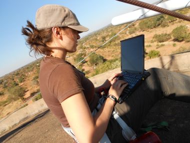 Mariya Zheleva's work in next-generation wireless networks takes her to remote locations all over the world. Here she is one top of a water tower during a field trip to Macha, Zambia, configuring a base station for a cellular network. (Photo courtesy of Mariya Zheleva)