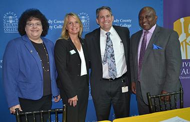 Pact signers: left to right, UAlbany Vice Provost Jeanette Altarriba, Dawn Sohns, assistant provost of SUNY Delhi, Laurence Spring, superintendent of Schenectady City Schools, and Steady Moono, president of SCCC. |