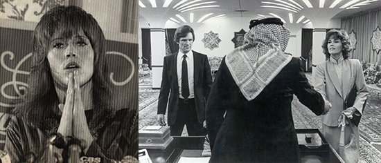 At left, Jane Fonda speaks in the University Gym in September of 1972; at right, in April of 1981 she performs a scene in the CC Assembly Hall with Kris Kristofferson for the movie Rollover. (Photos courtesy of University Archives) |