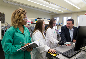 Halámek (far right) conducts research with students in his lab. (Photo by Carlo de Jesus)