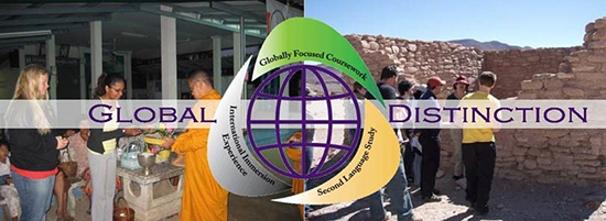 The Global Distinction is an add-on to any degree program that will appear as a milestone on the bottom of a student’s transcript. To earn it, a student must engage in foreign language study (four semesters or the equivalent); specific globally-oriented coursework; a study abroad semester and an eight-to-10-week internship or research abroad.