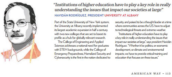 The December 2017 issue of American Way – the most read inflight magazine in the world – includes a 17-page feature dedicated to the Upstate New York region. The feature, an all encompassing focus on Upstate’s global economic impact, business diversity and innovation, includes UAlbany's growth and its addition of two new colleges: the College of Engineering and Applied Sciences and the College of Emergency Preparedness, Homeland Security and Cybersecurity.
