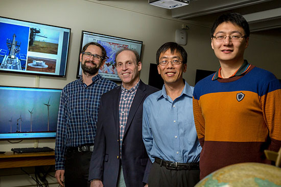 UAlbany atmospheric scientists from left: Justin Minder, Jeff Freedman, Liming Zhou, Geng Xia. (Photo by Brian Busher)