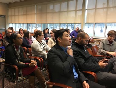 About 50 people attended a forum with the first of four candidates for the position of vice president of finance and administration. The forums continue all week. (Photo by Margaret Hartley) |
