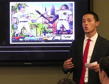 UAlbany senior Aniel Luna presents a sales pitch for a client in front of executives. |