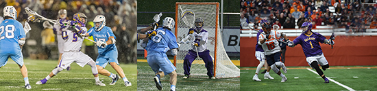 Great Danes standouts, left to right, senior attackman Connor Fields, senior goalkeeper JD Colarusso and freshman attackman Tehoka Nanticoke. (Photos by Bill Ziskin, Bob Mayberger and Greg Wall) |
