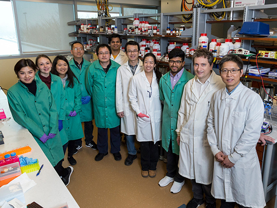 Chemists Max Royzen (one from right) and Jia Sheng (far right) have received federal grants in total of just under $900,000. (Photo by Brian Busher) |