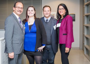 Ivan Bart '85, CEO of IMG Models Worldwide, addressed a scholarship dinner earlier this month. Pictured above are, from left, President Havidán Rodríguez, Jessica Spiak ’17 (recipient of the Kelsey Scholarship), Bart and Rosy Lopez. (Photo by Brian Busher) |