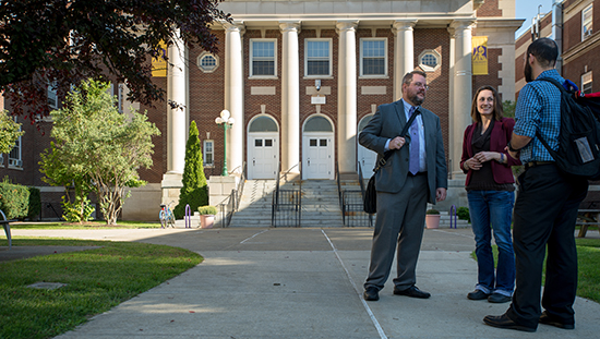 Karl Rethemeyer, who was recently named dean of Rockefeller College of Public Affairs & Policy, and Associate Professor Erika Martin talk to a student outside the college on the Downtown Campus. (Photo by Mark McCarty)