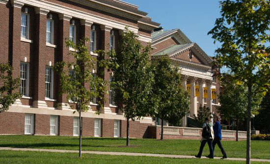 Students walk by Draper Hall on the Downtown Campus, the home of the School of Criminal Justice. (Photo by Mark McCarty)