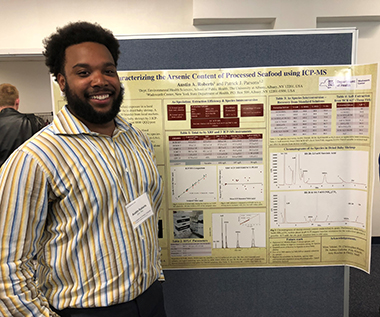 Among the research presented was that of Austin Roberts, a fourth-year environmental chemistry graduate student mentored by Patrick Parsons, professor of Environmental Health Sciences. Roberts studied the impacts of arsenic exposure on the Chinese community in Albany by looking at the levels and type of the arsenic species found in foods, traditional Chinese medications and cosmetics.