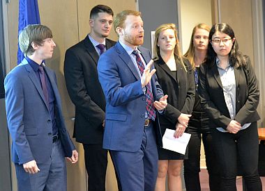The class makes its presentation. From left, Albany Law students Andrew Carpenter, Anthony Bargnesi, Jonathan Pritchard, Julia Kosineski; and Rockefeller College students Molly Johnston-Heck and Haining Sun. |