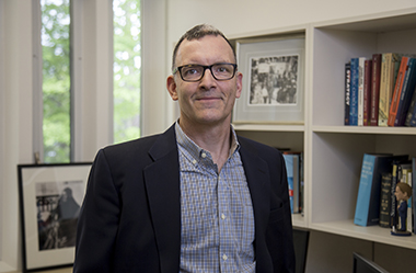 Gerald Marschke, an expert in the demographics of the scientific workforce, is shown in his office in Building 25. (Photo by Brian Busher)