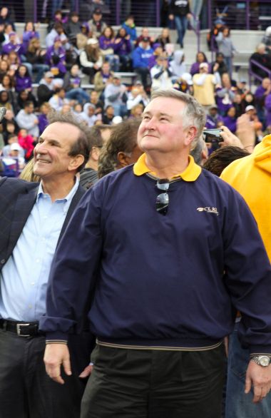 Peter Bulger, right, an avid supporter of UAlbany athletics, is pictured at the 2013 Homecoming Game. Bulger recently added a $500,000 planned gift to the scholarship that bears his name. (Photo by Paul Miller) |