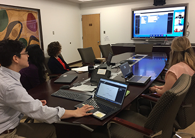 Beth Feingold, left, and research team members Xiaobo Xue, Christine Bozlak and graduate student Melanie Mongillo, video conference with partners to collaboratively test a software being used for the project. |