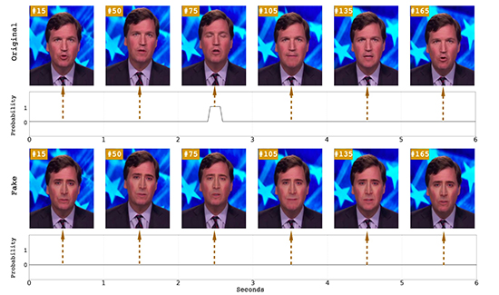 A team of researchers at UAlbany used eye blinking detection on an original video (top) and a DeepFake generated fake video (bottom) to