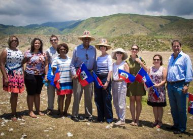 The SUNY sustainable village team, on a 2017 trip to Akayè, Haiti, includes Chairman H. Carl McCall and Chancellor Kristina Johnson (center, in straw hats) and CID's Heather Senecal (in green dress). (Photo courtesy of SUNY) |