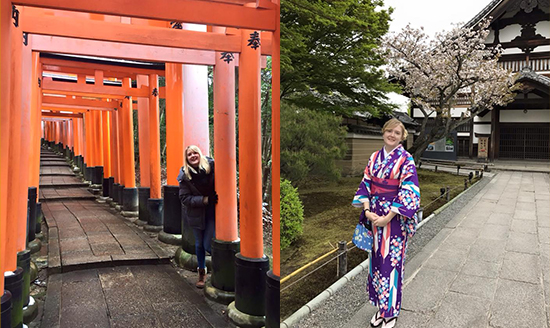 Courtney Elias, shown in two of her study abroad sojourns in Japan, in May became the first University at Albany student to graduate with Global Distinction. |