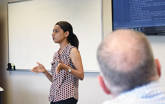 Rutuja Sha, left, a graduate student in the College of Engineering and Applied Sciences, has spent the summer building a 'chatbot' at CTG UAlbany. (Photo by Ben Meyers) |