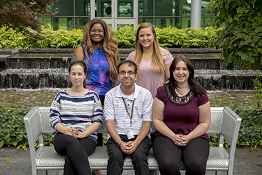 The 2018-19 cohort of RNA Fellows, in the courtyard of the Life Sciences Research Building, are top row, left to right, Deniece Brown and Serene Durham; seated, left to right, Haley Caldwell, Waqas Awan and Samantha Ingenito. (Photo by Brian Busher) |