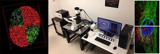 At left, a surface-rendered 3D reconstruction of a cell through use of a STimulated Emission Depletion (STED) system; center, a microscope workstation similar to one now available to area scientists; right, differing resolutions of a cell from a conventional confocal microscope (at top) and with STED (bottom).