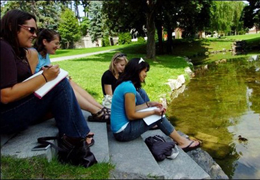 Participants in the Writing Marathon held in Saratoga Springs put down their words by the side of a stream. |