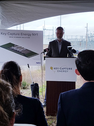 Dan Fitzgerald, co-founder and chief development officer of Key Capture Energy, speaks at the KCE NY 1 Project groundbreaking on Sept. 26 in Stillwater, N.Y. Photo by Matt Grattan. |