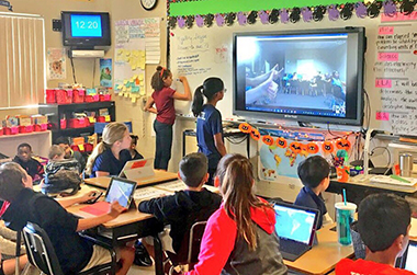 Children from one classroom engage with another via Skype in a mystery-Skype contest — one of the ways modern technology is enhancing learning, according to Stephanie Affinito. |