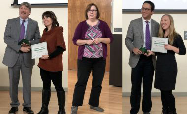Sustainability Director Mary Ellen Mallia, center, announces the top performers of this year's Energy Campaign. At left, VP for Finance and Administration Todd Foreman presents a Terra Award to Dewey Libary's Bridget Collins. At right, VP for Student Affairs Michael Christakis presents the student Terra to Rebecca Benjamin. |