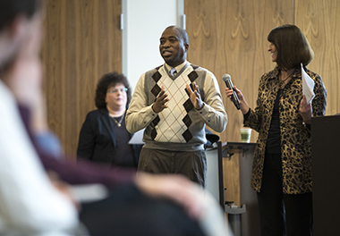 Ekow King and Martha Asselin, co-chairs of committee looking at how the University supports the student experience, discuss their progress at a town hall meeting of the Middle States self study steering committee. (Photo by Patrick Dodson) |