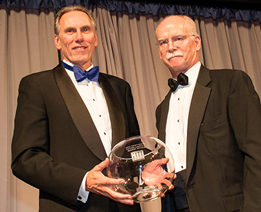 Daniel P. Nolan, at left, is presented with his Citizen Laureate Award in 2014 by University at Albany Foundation President George Hearst III. |