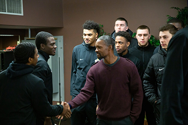 Brian Straughter, president of Turf Hotels, gave career advice to the UAlbany men's basketball team in January for this semester's Speaker Series. Photo by Scott Freedman. |