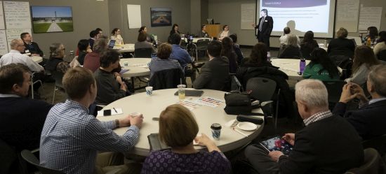 Vice President for Finance and Administration Todd Foreman addresses the group at the kick-off for UAlbany's Climate Action and Sustainability Plan. A working plan is expected to be implemented by the end of the year. (Photos by Patrick Dodson) |