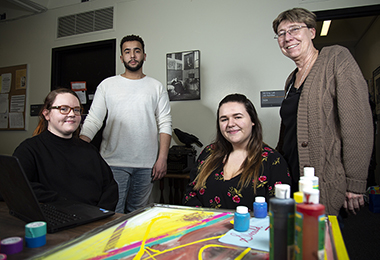 From left, graduate student Brenna Croker, undergrads Terrik Kobryn and Savannah Lanz, and Writing Center Director Jil Hanifan. (Photo by Patrick Dodson) |